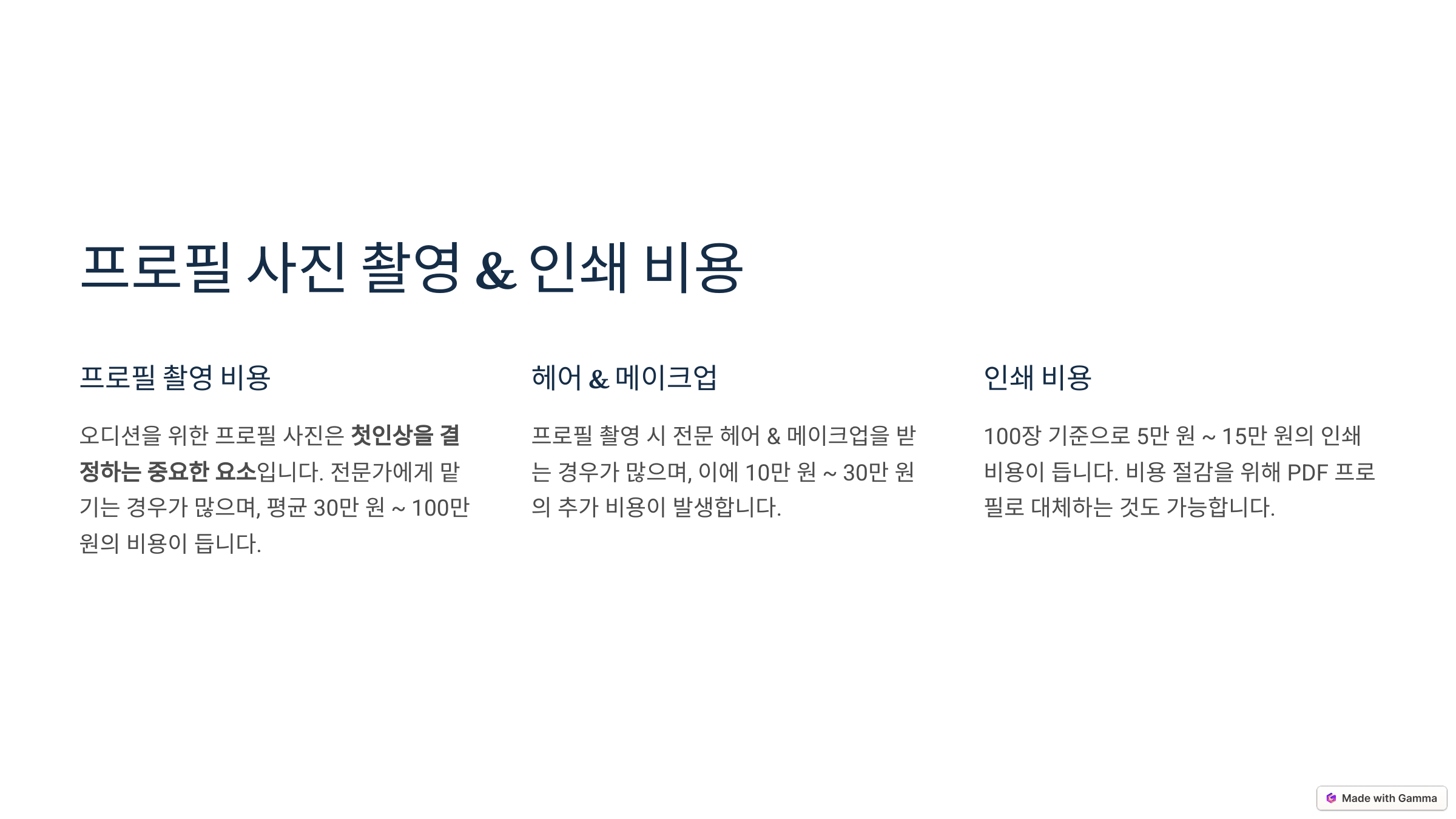 - 오디션 지원비: 무료 ~ 10만 원 (일부 유료 오디션 있음)