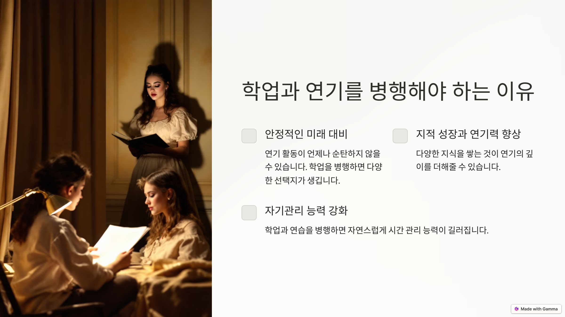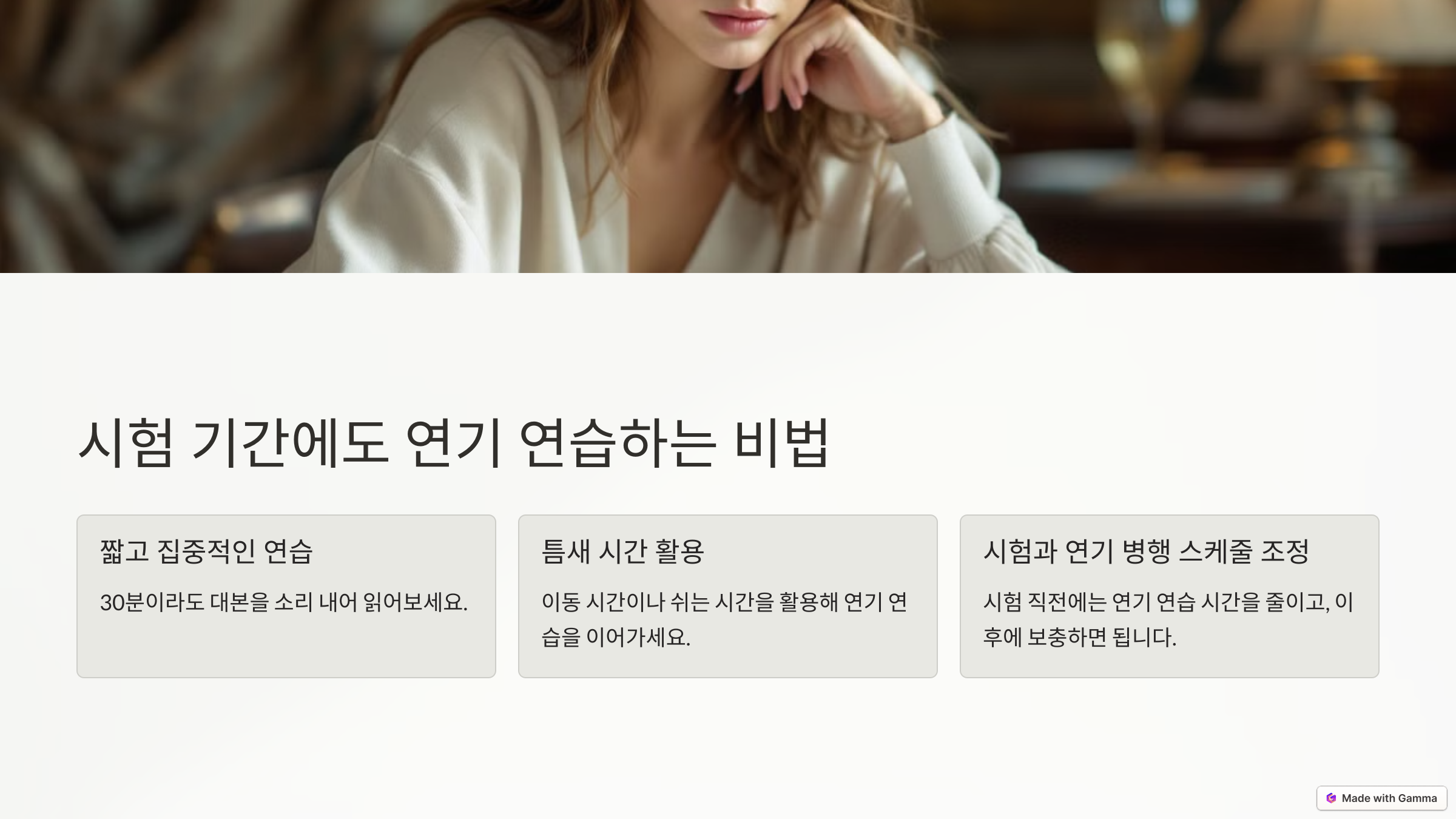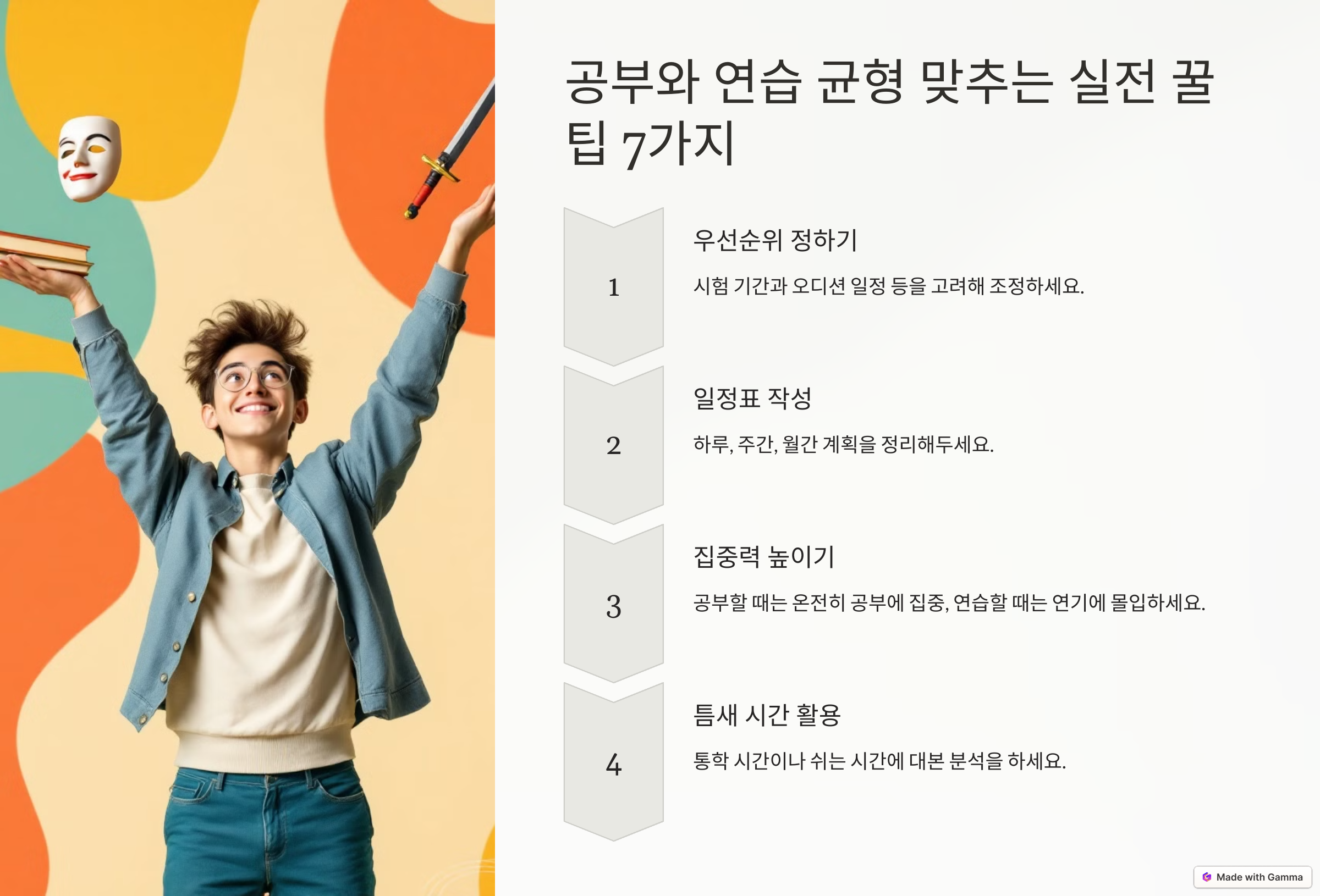 ✅ 시험과 연기 병행 스케줄 조정: 시험 직전에는 연기 연습 시간을 줄이고, 이후에 보충하면 돼요.